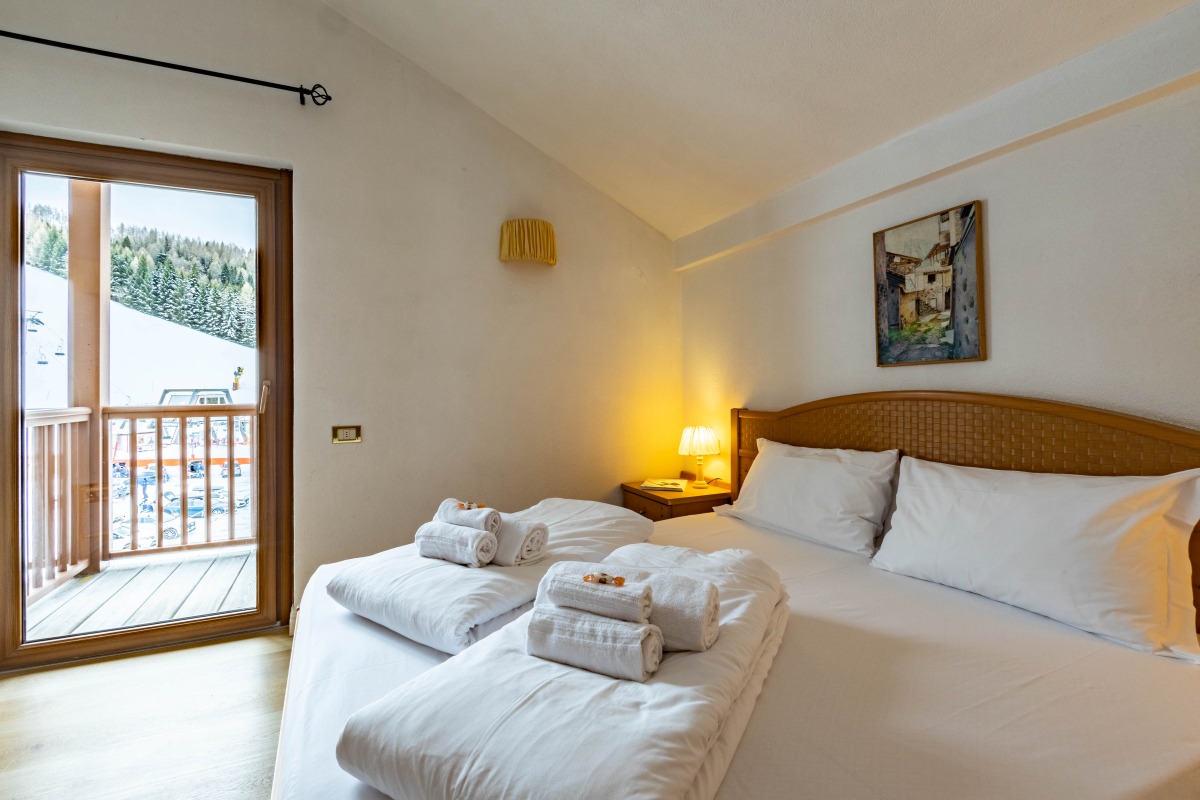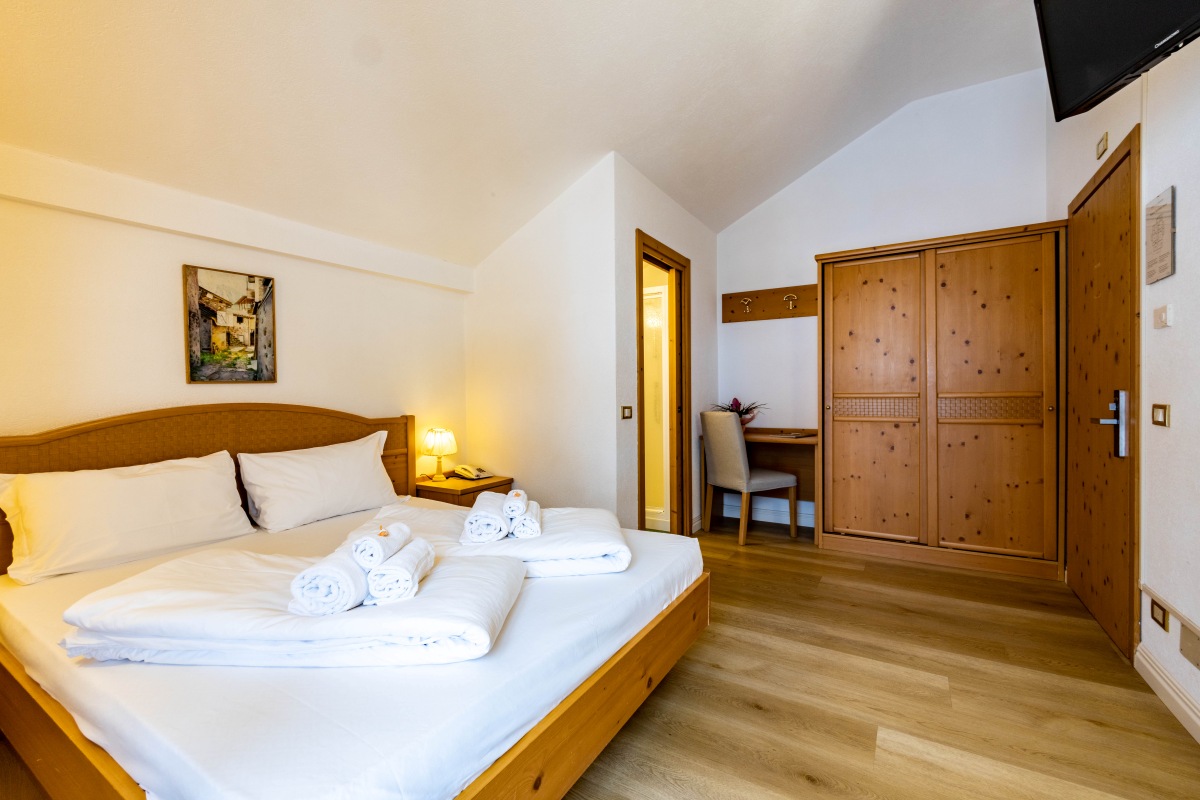 Accogliente e luminosa, questa camera matrimoniale offre una splendida vista sulle piste da sci in inverno e sulle montagne verdeggianti in estate.